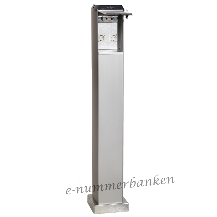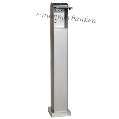 Uttagsstolpe med 2 st schuko (max 16A) och 2 st elmätare C11. Lucka med standardlås och 2 nycklar. Kapsling i aluminum.