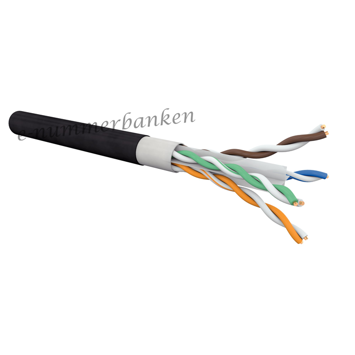 Halogenfri dubbelmantlad kat6 U/UTP utomhuskabel. Inomhus tas den yttre PE-manteln bort med inbakad rivtråd. 100m ring